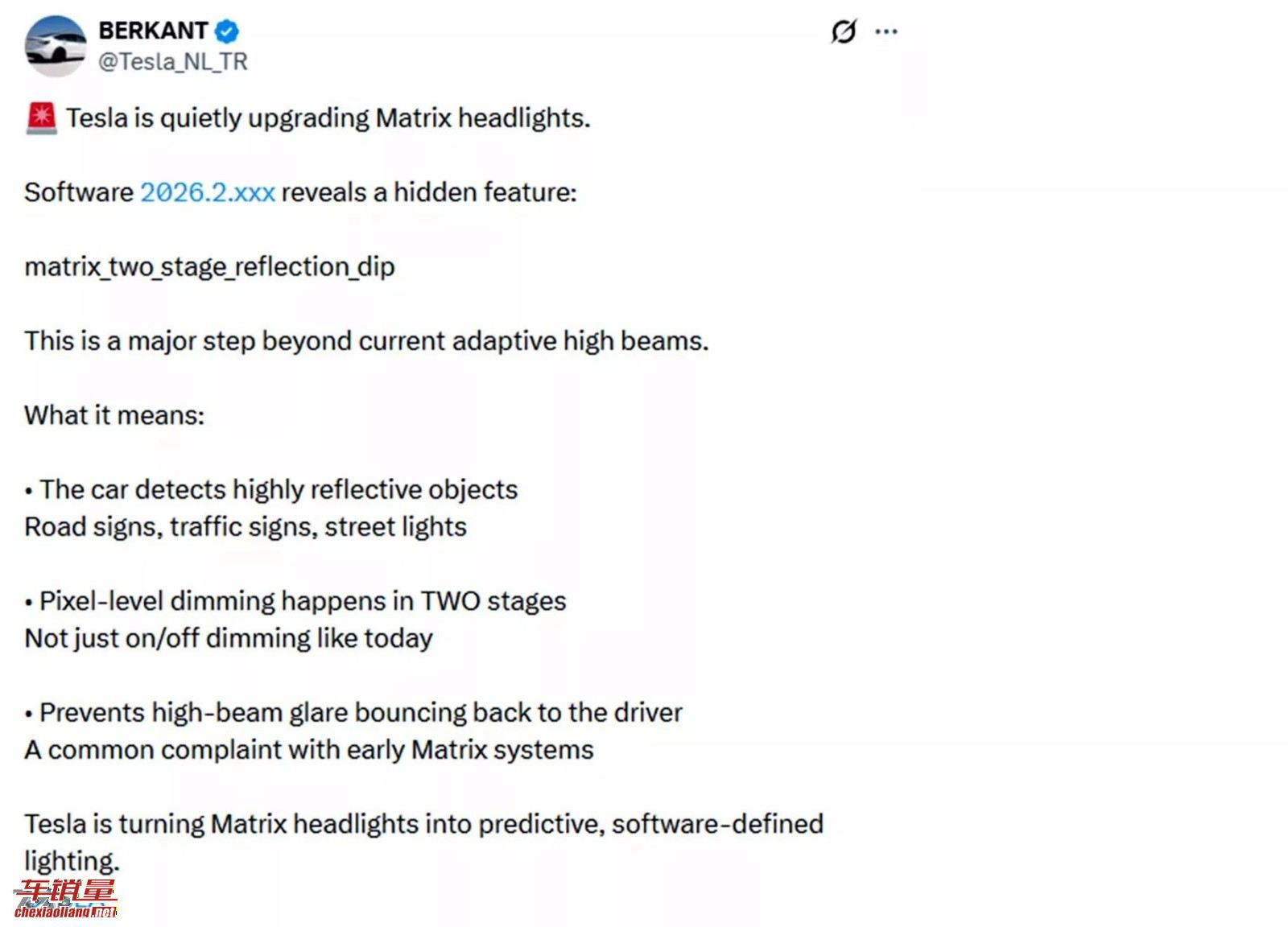 电动车品牌 特斯拉 旗下 Matrix LED 头灯功能,传出即将迎来新一波软体升级。根据海外社群平台流出的程式码资讯,新功能可能针对长期以来困扰部分驾驶的「反光路牌过亮」问题进行优化,进一步细化自适应远光灯的控制逻辑。