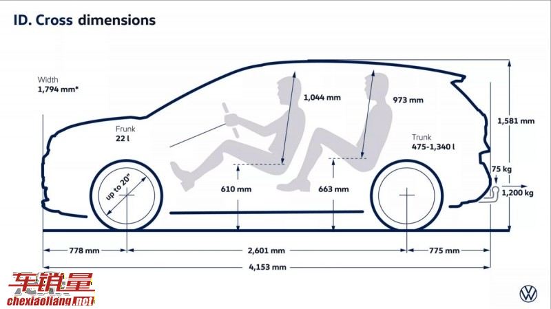 车身尺码方面,ID. Cross 车长为 4,153 mm、车宽 1,794 mm、车高 1,581 mm,轴距为 2,601 mm,整体定位属於小型跨界 SUV。大众 也表示新车将提供最高 20 寸轮圈配置,并具备 1,200 kg 拖曳能力。